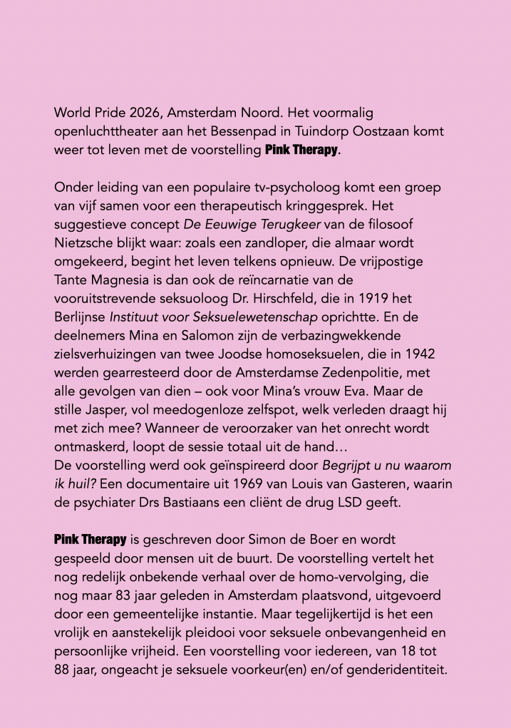 In juli 2026 wekt de voorstelling Pink Therapy het oude openluchttheater weer even tot leven, wanneer de World Pride en de Euro Pride in Amsterdam zijn.